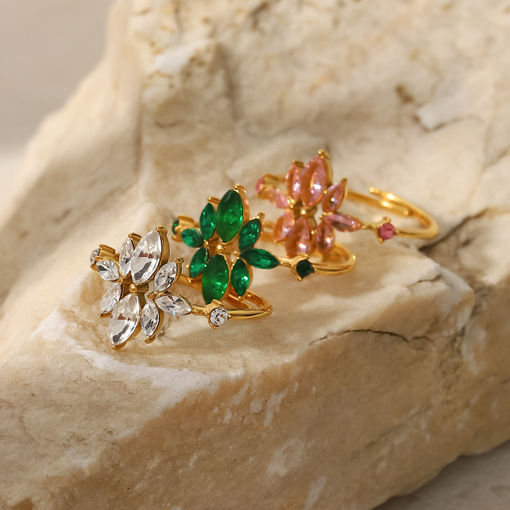 18K Gold Plated Thin Floral Zircon Ring Stainless Steel Green Zirconium Adjustable ring
